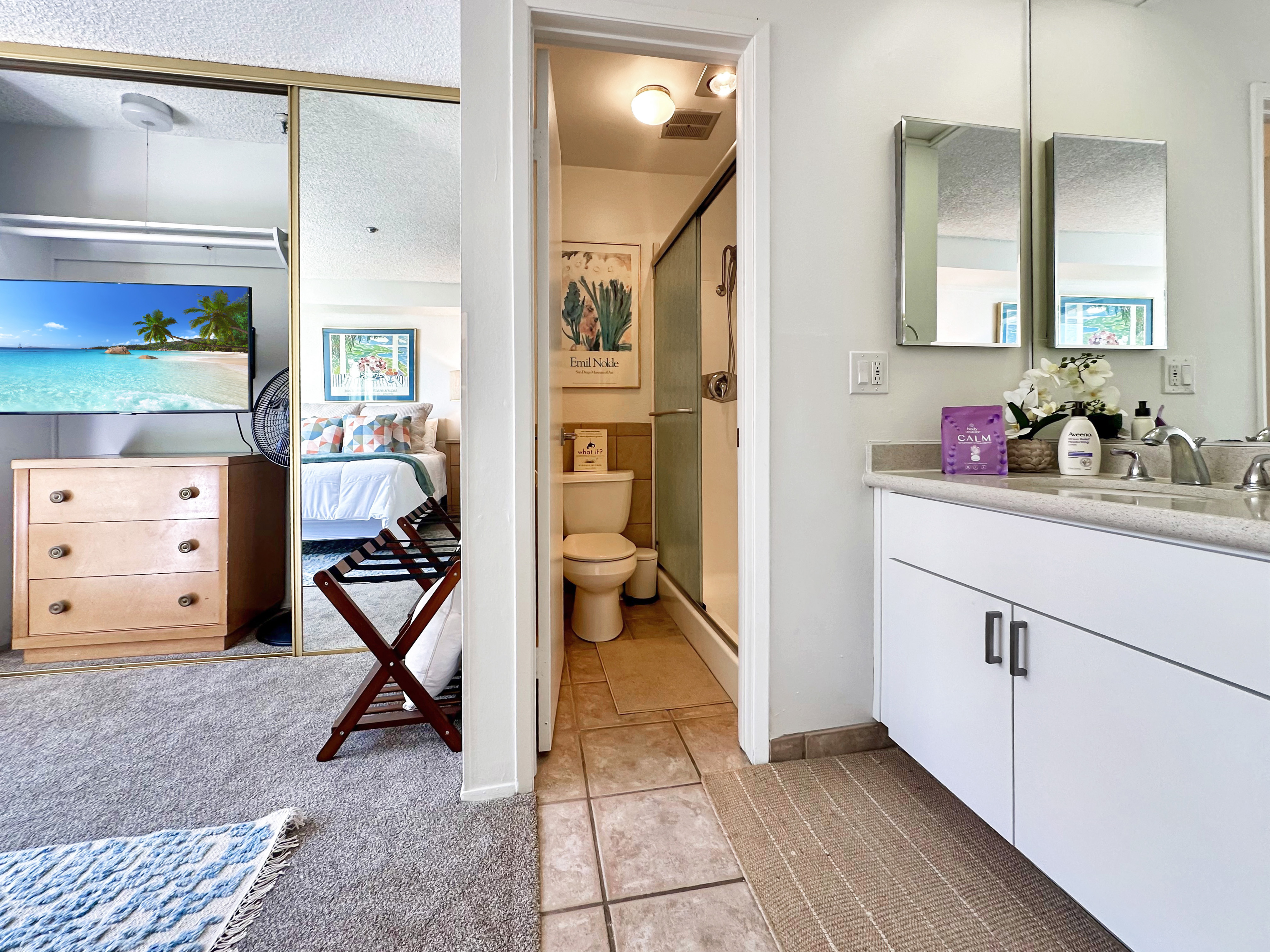 Sink area & compact bathroom located in bedroom, perfect for a rinse after a day at the sea!